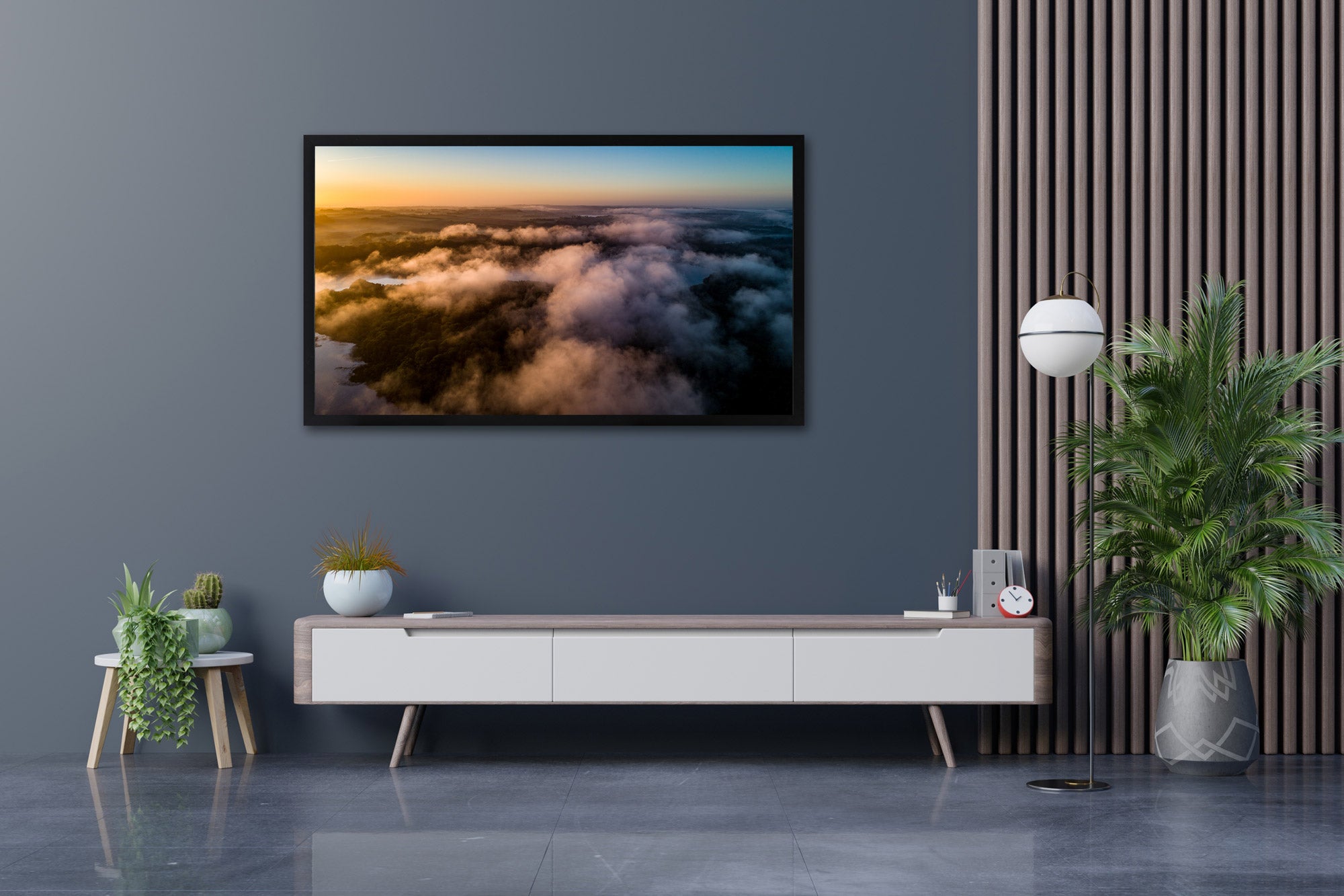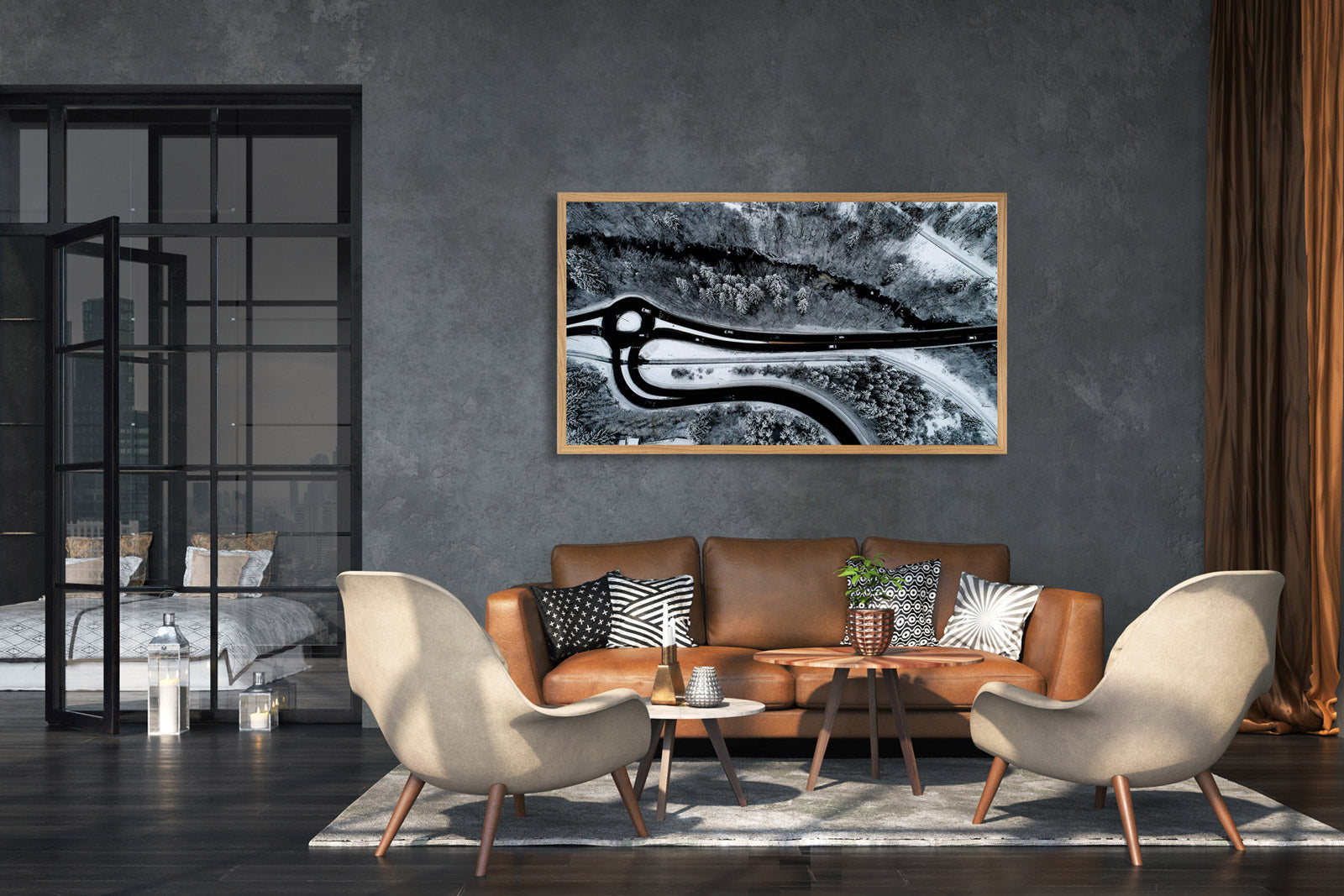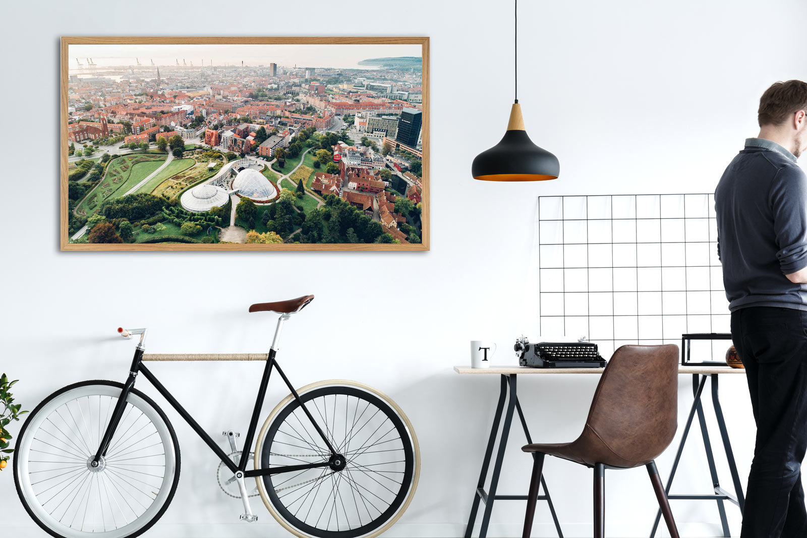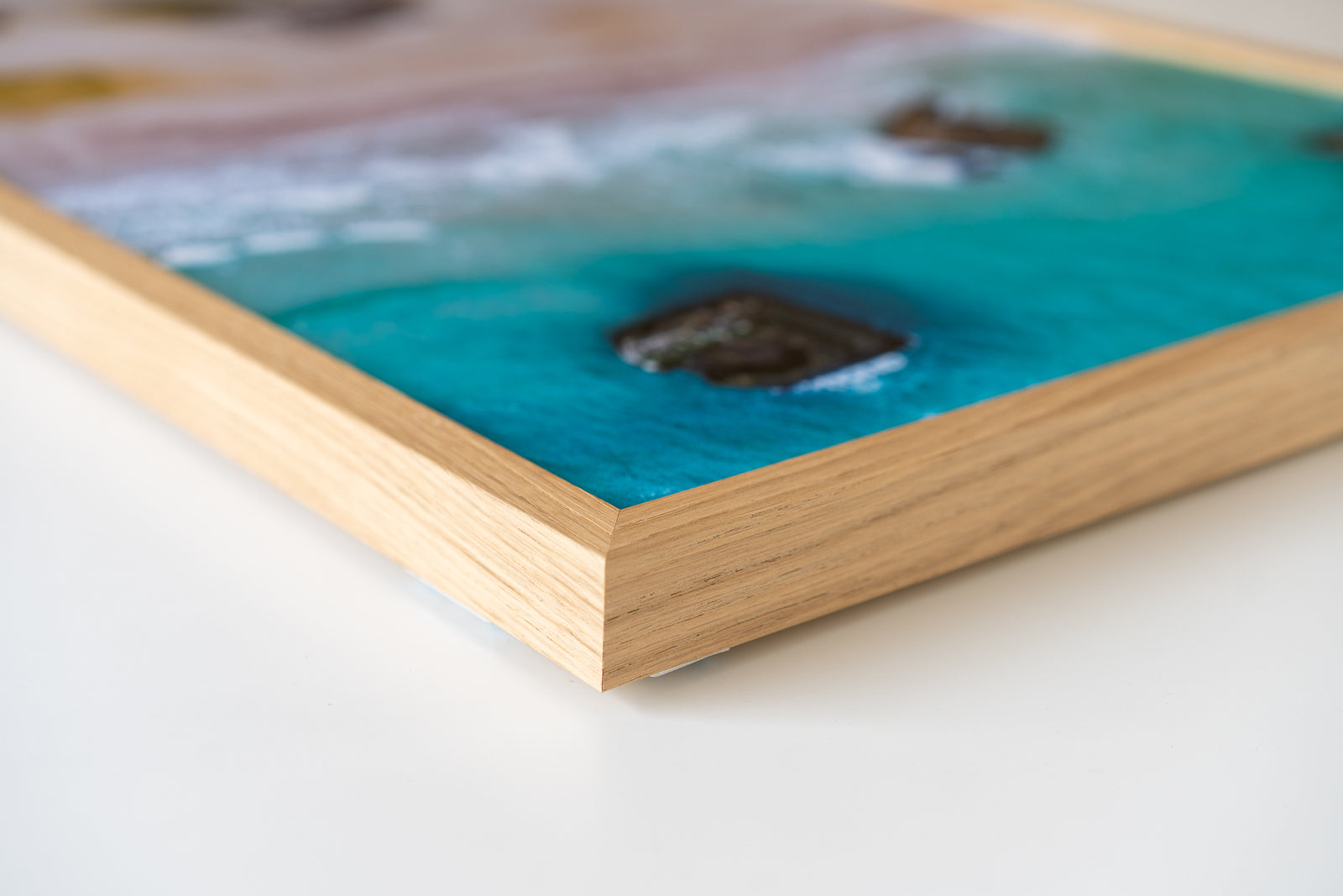 Dette er den stilfulde og klassiske løsning, hvor et Silk Fine Art Hahnemühle Giclée print (den ypperste print- og papirkvalitet) opklæbes på en plade og indrammes med ramme i lys eg eller mat sort og 2 mm glas.