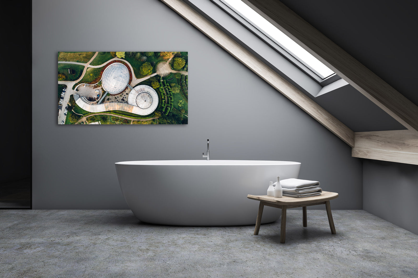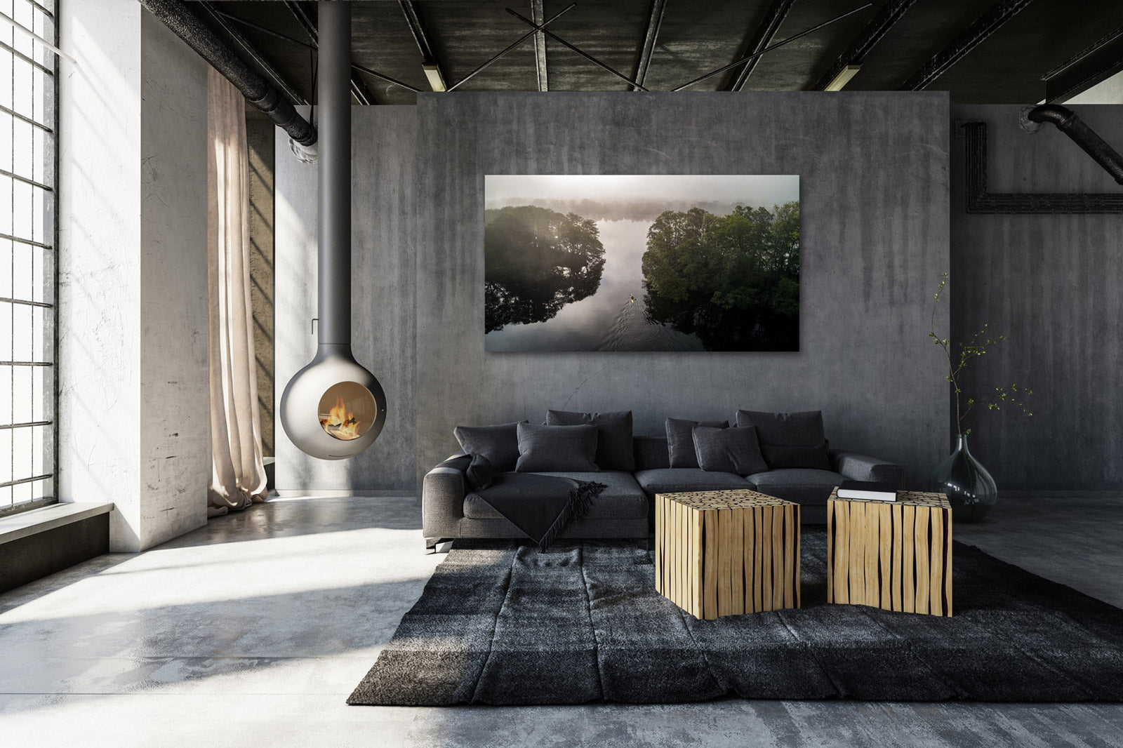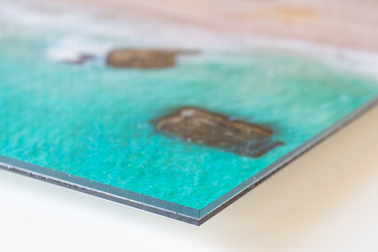 3 mm akryl (plexiglas), med et Fine Art Hahnemühleprint monteret på indersiden, hvilket skaber et skarpt billede med ekstra dybe og kraftige farver grundet akrylens blanke overflade. Leveres med 3 mm alu sandwich som bagplade og skjulte beslag, så billedet får en svævende effekt ca.15 mm fra væggen.